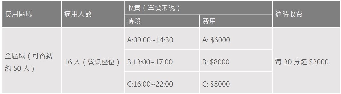 • 使用場地請勿逾時,以免影響下個時段使用者之權利;欲延長使用時間,需通知本教室,經同意始可延長加購使用時間。每日最晚至晚間十點須離場。逾時費用請參照收費標準。